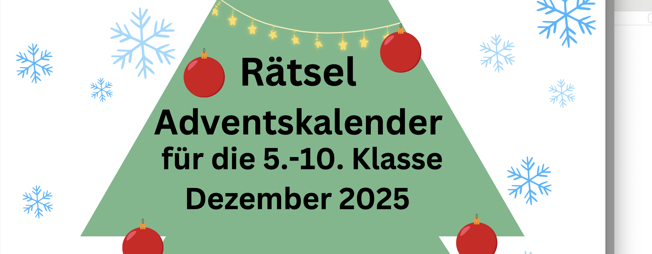 im Dezember wird es einen Rätsel-Adventskalender für die Orientierungs- und Mittelstufe geben. Das Projekt ist auf Initiative der Schülerpaten gestartet und wird nun von uns umgesetzt.